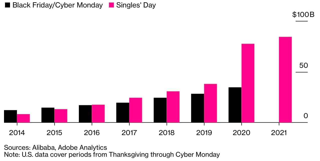 Evolución del Singles Day Vs BlackFriday / Cyber Monday, en el mercado estadounidense, a la espera del resultado de este año.