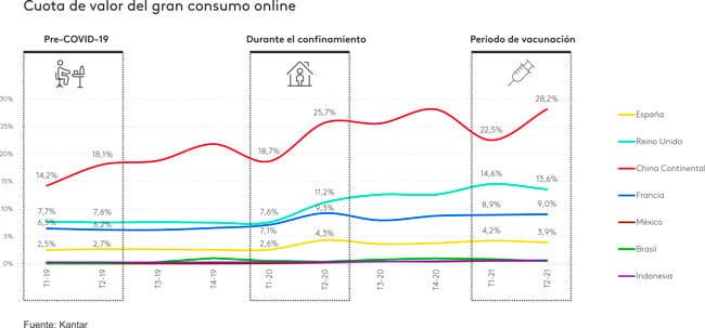 A través de datos de Kantar . “El crecimiento del eCommerce de gran consumo a nivel global será del 13% en 2021, tres puntos más que el año anterior. China lidera el camino con un crecimiento del 25%, seguido por el Reino Unido con un 11%. En España el comercio online de alimentos creció un 2,4% en 2021 vs 2019