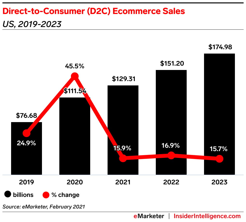 Alcanzarán los $ 151.20 mil millones en 2022, crecerán un 16.9% Las compras de D2C solo representarán el 2,5% de las ventas minoristas totales en el próximo año, estas marcas han desafiado y revolucionado con éxito la industria minorista al diversificar la experiencia del consumidor.