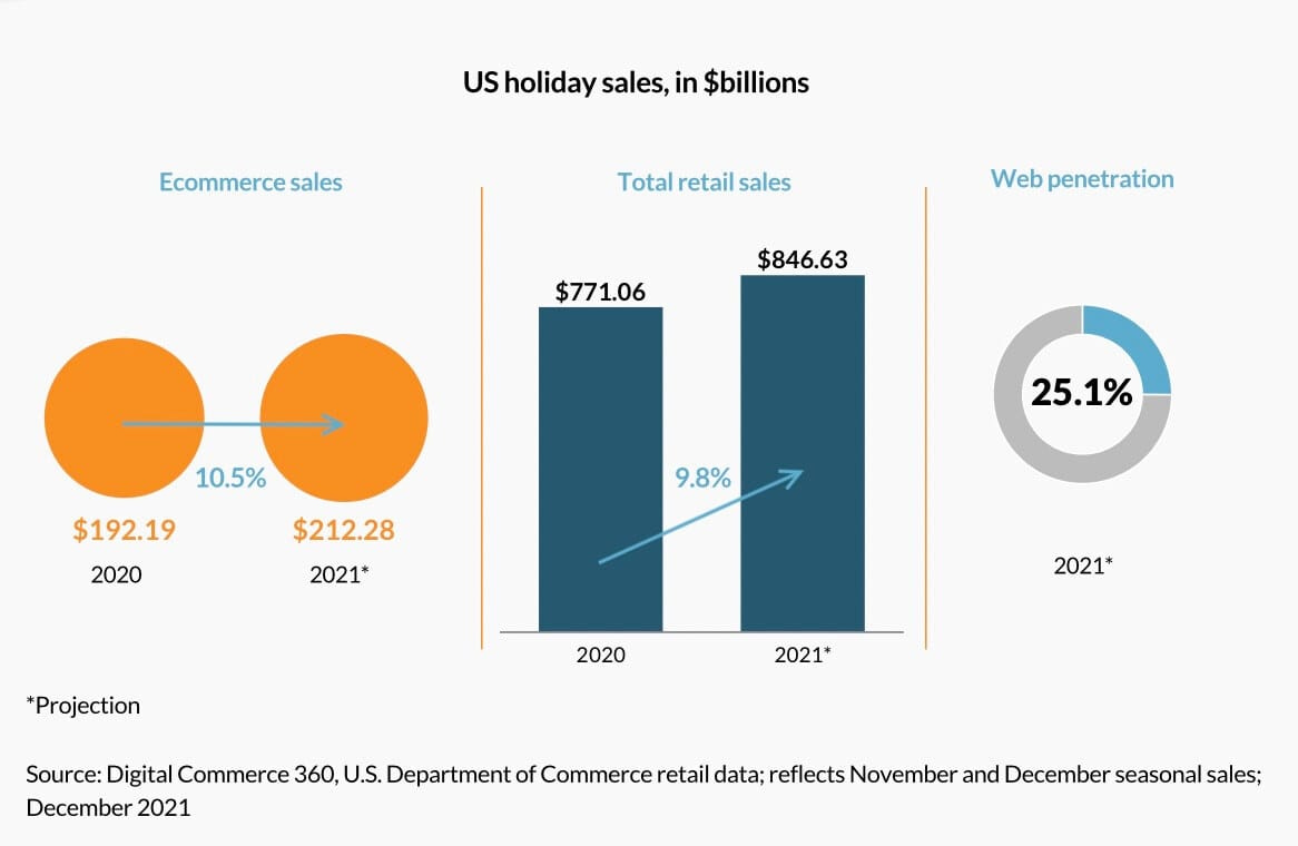 🎄Una vez pasada la Thanksgiving 2021 solo queda hacer foco en el último evento comercial del año. Las proyecciones de venta online para la campaña de navidad 2021. Tomando EE.UU y el período de noviembre a diciembre, se espera que las ventas de ecommerce superen por primera vez la marca de 200.000 millones de dólares, alcanzando 212.280 millones de dólares.