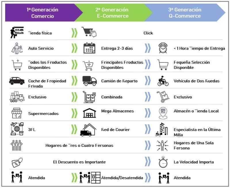 Q-commerce y logística urbana. La evolución que ha experimentadoel comercio en las ciudades y las características principales de las diferentes generaciones del comercio B2C.