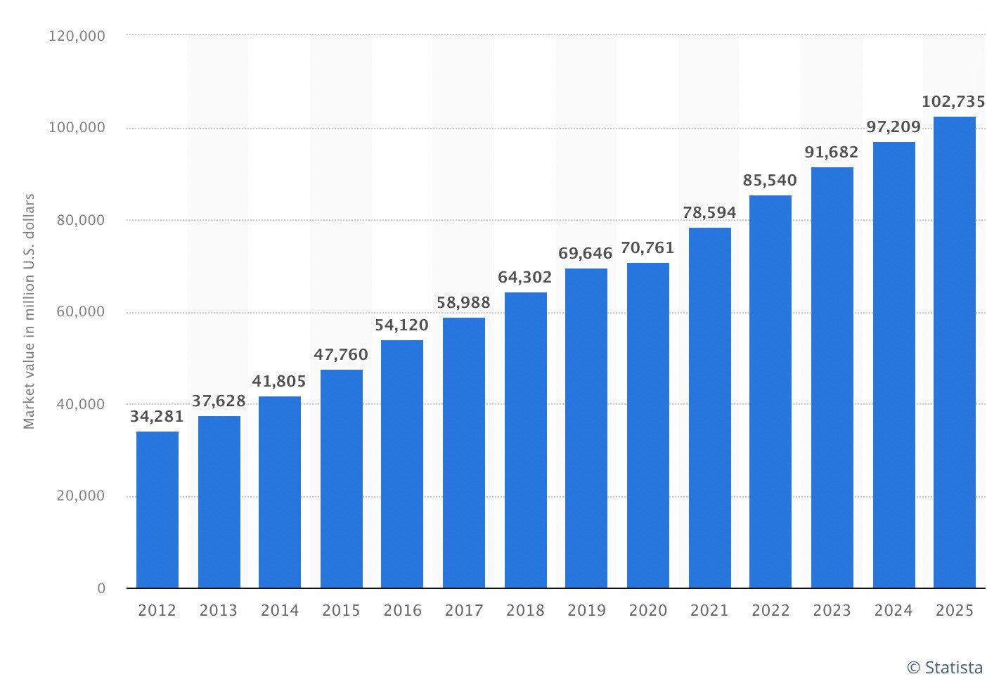 Imperdible la gráfica que muesta el valor del mercado de Sneakers a nivel mundial de 2012 a 2025.
