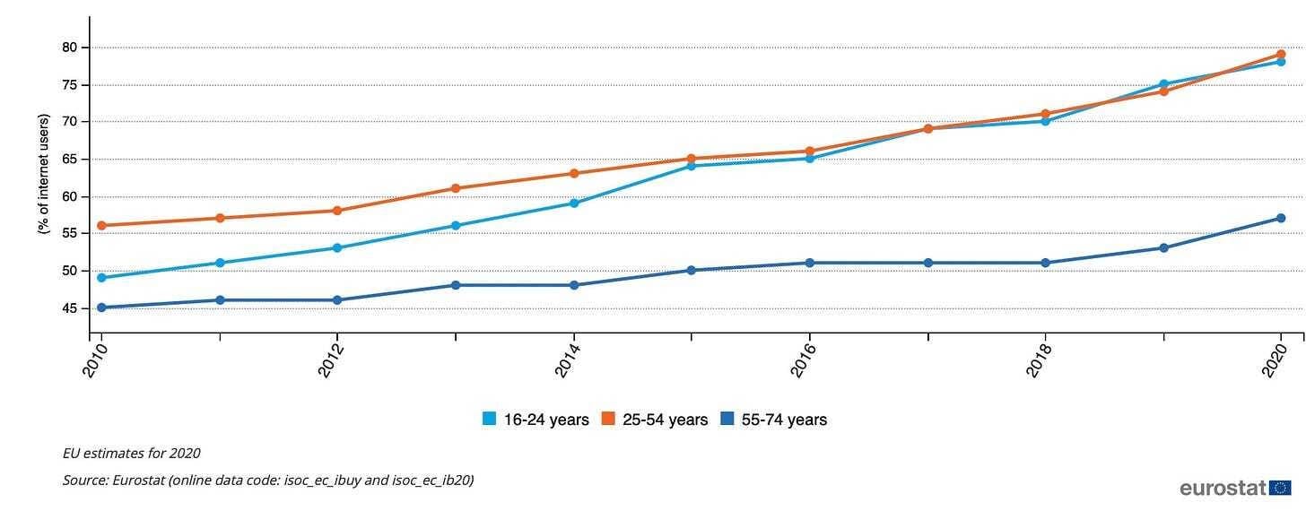 Una radiografía a la evolución del comprador online en Europa, por edad desde el 2010 al 2020.