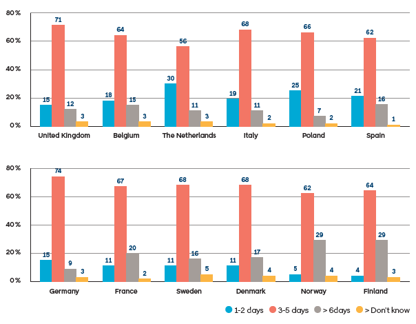 Interesante ver cómo varían las expectativas, en los tiempos de entrega de un pedido online por país. Las entregas más rápidas cada vez se han vuelto más importantes para el consumidor.