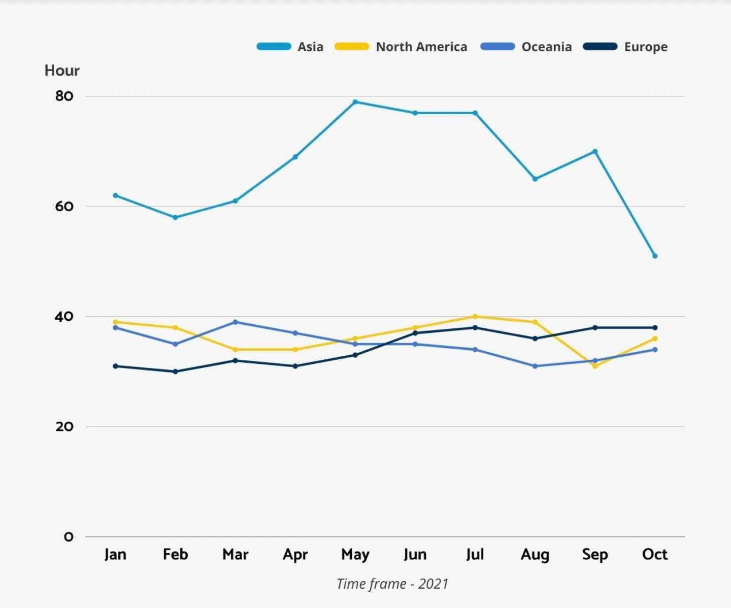Muy llamativo el análisis del tiempo de permanencia de paquetes en puntos de recogida por continente. La mayoría de los paquetes fueron recogidos de los puntos de recogida en todas las regiones antes de las 48h.