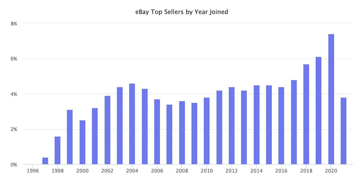 ☠️ La envejecida población de vendedores en eBay o el problema de la falta de interés de los nuevos vendedores por eBay. Una gran parte de las ventas provienen de vendedores que llevan más de cinco años y más de la mitad de estos, se unieron hace diez años.