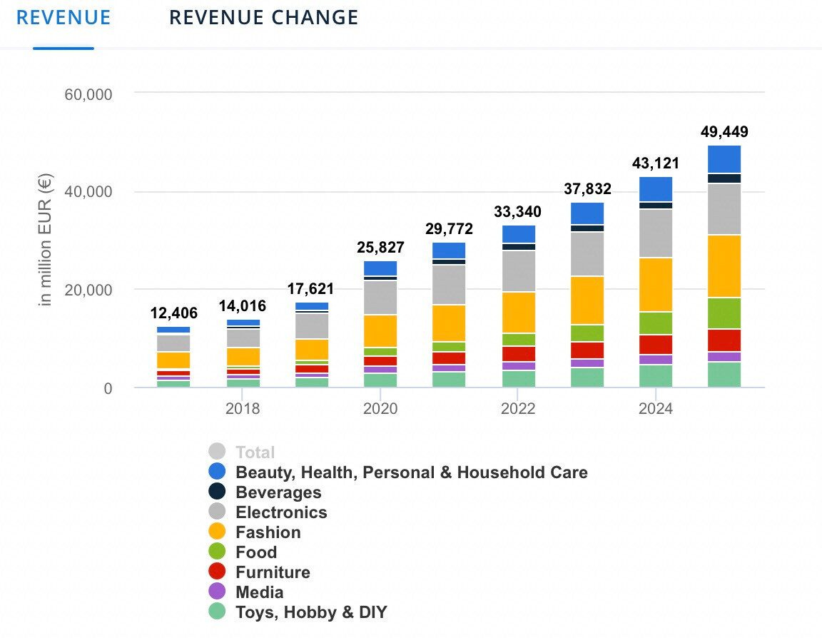 Los ingresos muestran una tasa de crecimiento anual (CAGR 2022-2025) del 14,41%, lo que da como resultado un volumen de mercado proyectado de 48.217 millones de euros para 2025.