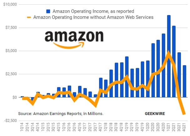Por cierto, la importancia de AWS en la evolución de Amazon. Amazon habría registrado una pérdida operativa de 1.800 millones de dólares en el cuarto trimestre de 2021 si no fuera por Amazon Web Services.
