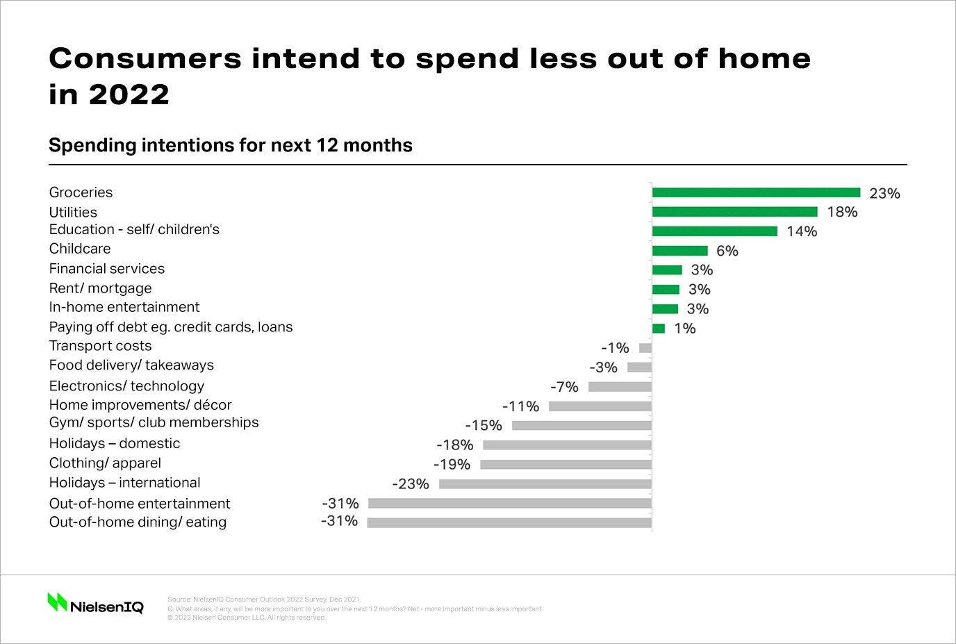 CPG bien posicionado. El consumidor espera gastar más en comestibles, servicios públicos y artículos básicos en casa. Un porcentaje indica que gastarán menos fuera de casa.