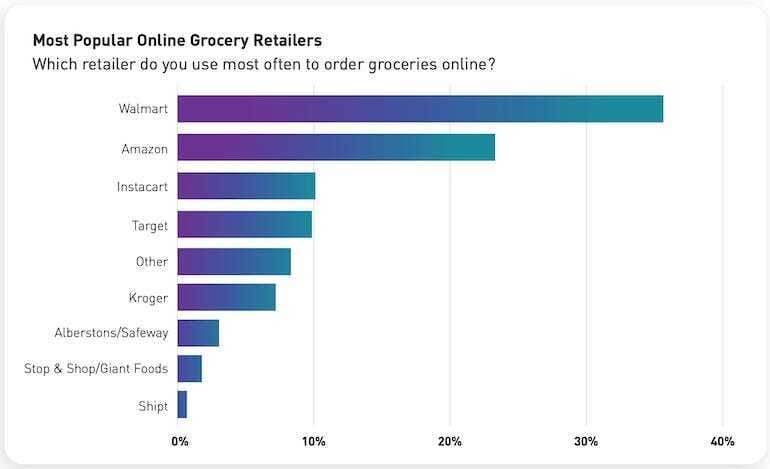 Una foto al sector de la alimentación online en EE.UU. Walmart y Amazon lideran el mercado. Casi tres cuartas partes de los compradores dicen que son usuarios de Grocery online.
