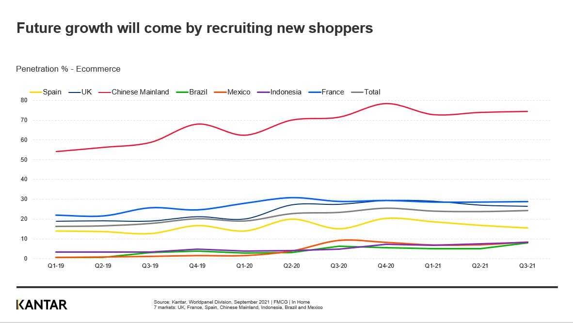 El eCommerce comienza su desaceleración. Según datos de Kantar, de enero a septiembre de 2021, experimentó un crecimiento del 17 % en comparación con un asombroso aumento del 42 % en el año anterior. Tendrá que adaptarse en 2022 si quiere continuar su crecimiento estelar. Las plataformas de eCommerce tendrán que encontrar nuevos compradores para impulsar el éxito adicional.