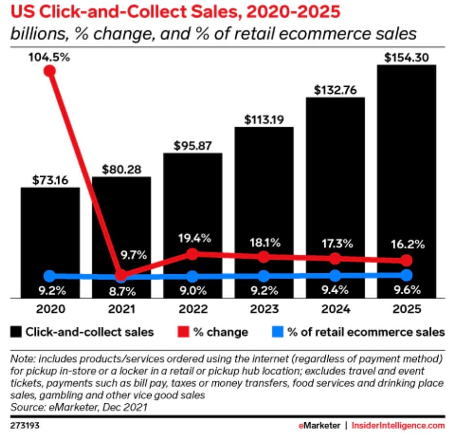Los compradores estadounidenses gastarán 95.870 millones de dólares a través de click and collect este año, un aumento del 19,4 % (YoY). Sin embargo, el gasto está muy por debajo de lo esperado, marcado por un escenario totalmente diferente debido a la modificación de las medidas Covid.