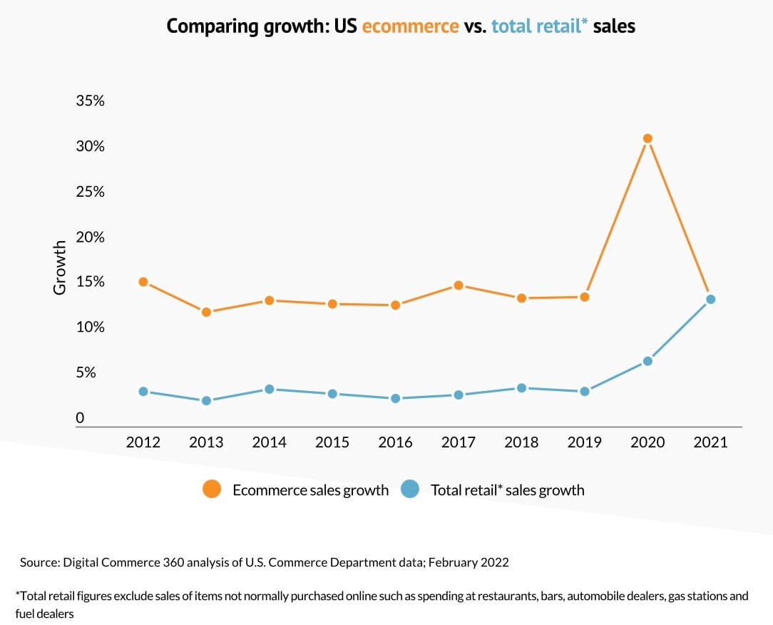 📉 El mercado de EE.UU. nos ofrece una buena comparativa de las ventas de eCommerce Vs frente a las tiendas . Hace una década, el eCommerce representaba el 8 % del total de compras minoristas frente al actual 20 %.