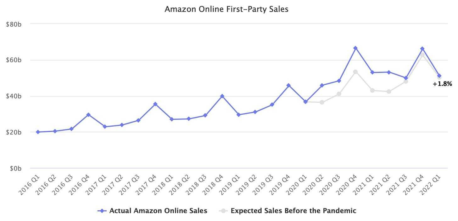 Sobre la ralentización del crecimiento de Amazon. Desde el primer trimestre de 2016 hasta el primer trimestre de 2020, las ventas en Amazon crecieron en promedio un 17 % año tras año, menos este año….