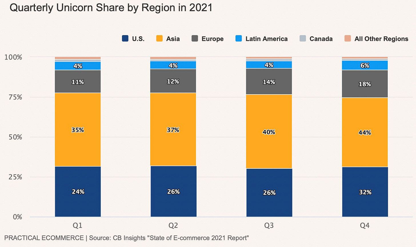 El 44 % de los unicornios mundiales de comercio electrónico se encontraban en Asia, la región más alta.