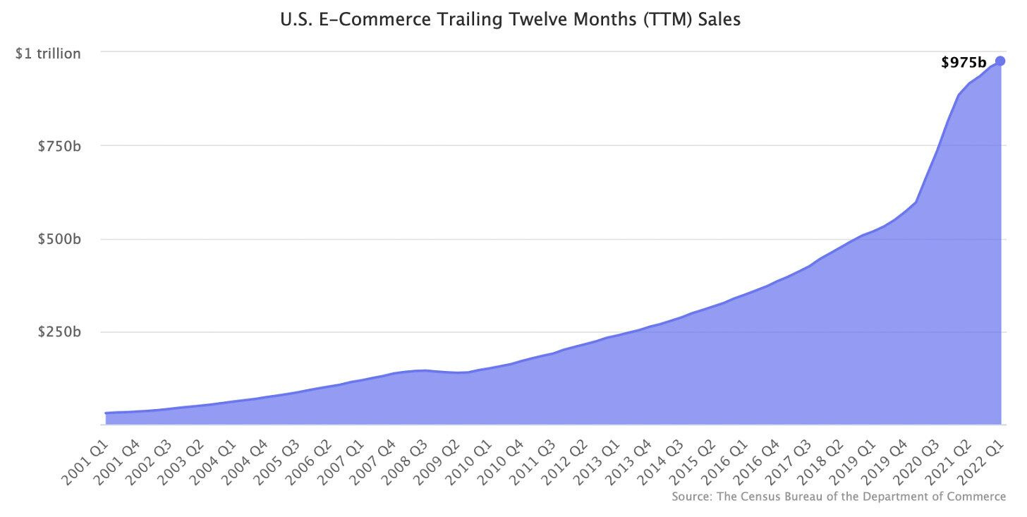 📉 El eCommerce de EE. UU. se acerca a 1 billón de dólares. A pesar de solo un ligero aumento de la cuota de mercado, el mercado del eCommerce casi se ha duplicado en tres años.