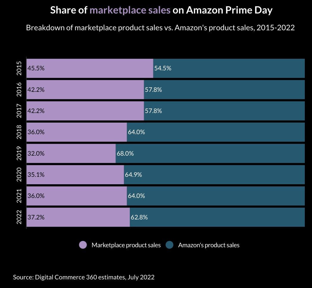 En el siguiente gráfico tienes una estimación, en la cual se advierte un cambio importante en Prime Day de este año, los productos del marketplace Vs productos de Amazon, obtuvieron la mayor proporción de ventas en la historia.