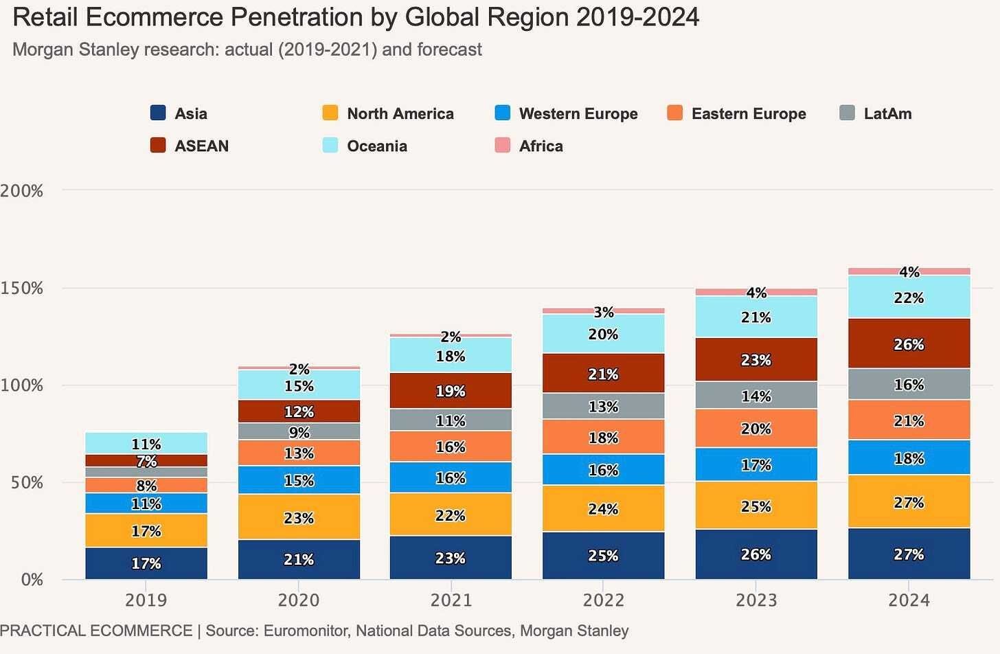 📉 La penetración del eCommerce en el Retail global. En todas las regiones del mundo, las ventas de eCommerce continúan aumentando. En algunas regiones del sudeste asiático y América Latina durante los próximos cinco años, el comercio electrónico podría crecer un 17 % y un 20 %, respectivamente.