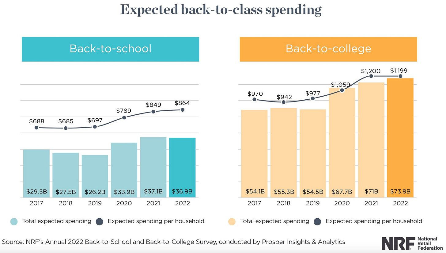 🎒 Ya estamos a mes y medio del Back to School 2022. La NRF ha publicado las tendencias de compra que se esperan para la campaña de este año en EE.UU, no he encontrado datos para Europa.