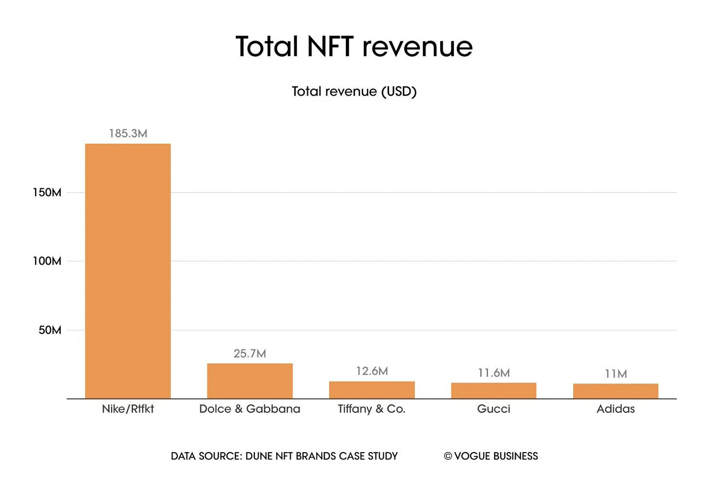 👟 Nike lidera el mercado de NFT con una facturación de 185,3 millones de dólares, marcando una gran diferencia con el resto de compañías que han apostado por la Web3. La adquisición de Rtfkt está dando sus frutos, la colección de avatares CloneX representó aproximadamente la mitad de esos ingresos.