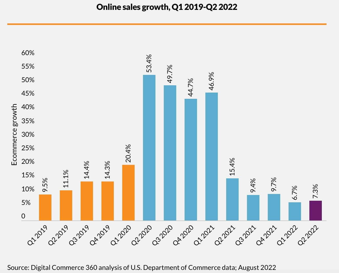 📉Una vistazo al comportamiento del eCommerce en EE.UU. Marcó su cuarto trimestre consecutivo de crecimiento de un solo dígito después de los saltos del 45%-50% durante el primer año de la pandemia. Crece un 7,3% en el segundo trimestre de 2022. Uno de cada cinco dólares gastados en retail provienen de pedidos online.