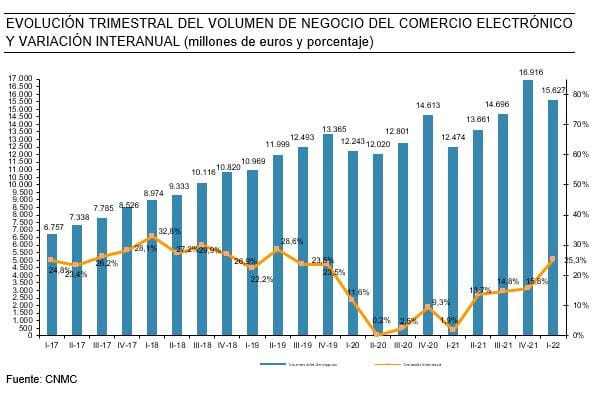 📉La CNMC publica los datos del Comercio Online del primer trimestre en España . (Nota oficial completa) Un periodo en el que el canal se ha disparado un 25,3% hasta 15.600 millones de euros.
