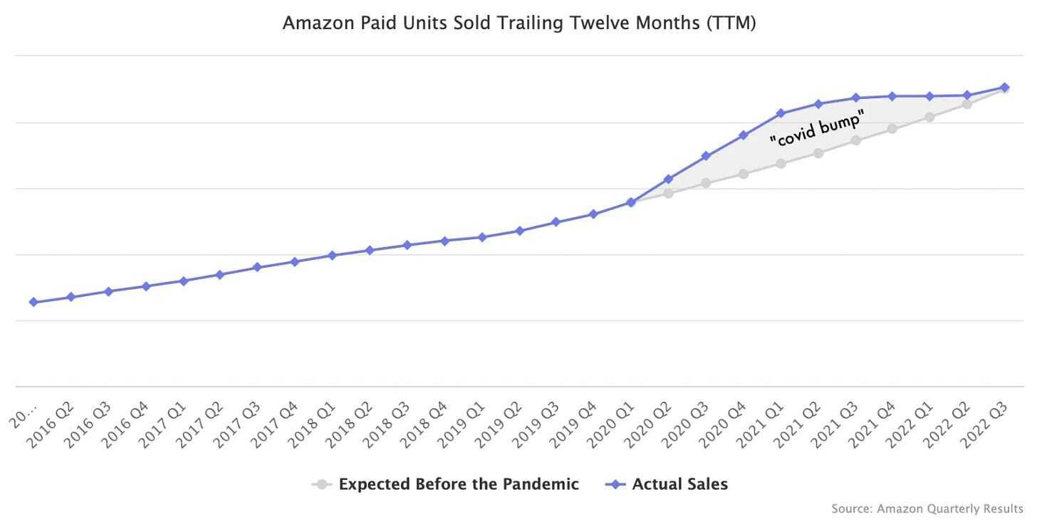 📦 Esta semana Amazon anunciaba los resultados del Q3 2022. (Nota oficial) Amazon creció un 11 % en el tercer trimestre. Más rápido que en los últimos cuatro trimestres, pero aún por debajo del promedio histórico. Como resultado, el número de productos vendidos en Amazon en los últimos doce meses es aproximadamente igual a los niveles que habría llegado incluso sin el aumento de la pandemia, suponiendo que no se ralentizó. Eso se debe a que el crecimiento del 46 % en el tercer trimestre de 2020, el 8 % en 2021 y el 11 % en 2022 suman algo menos de tres años de crecimiento del 20-21 %.