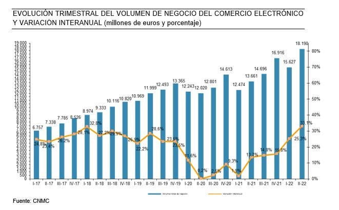 📉 Hace un par de días la CNMV publicaba el informe con los resultados del comercio electrónico en España en el segundo trimestre del 2022. El mercado online firma el mejor trimestre de la historia entre abril y junio, con 18.190 millones.