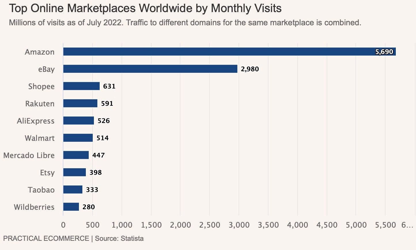 Con un promedio de 5.300 millones de visitas, Amazon lideró el mercado, seguido de eBay con aproximadamente 3.000 millones.