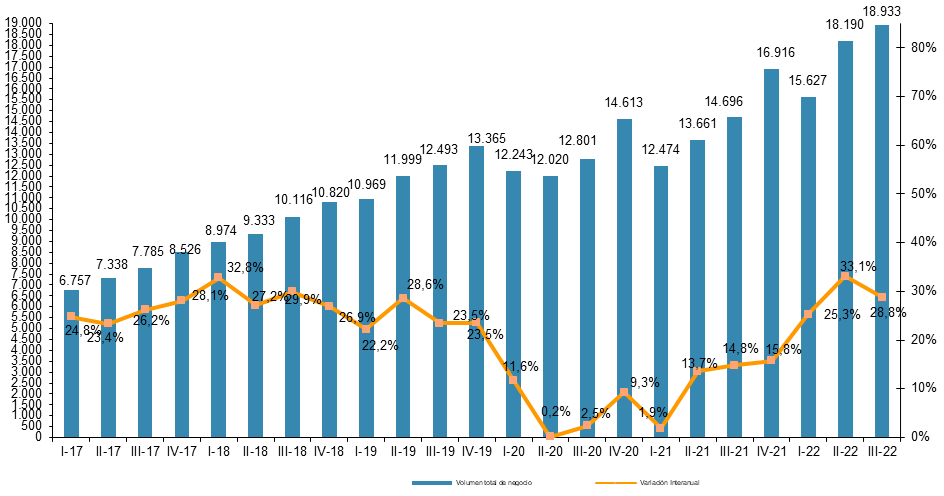 Si nos fijamos en el número de transacciones, en el tercer trimestre de 2022 se han registrado más de 333 millones de transacciones, un 17,1% más. Los juegos de azar y apuestas lideran el ranking por compraventas (7,6%).
