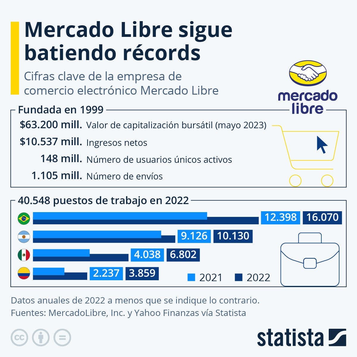 🎯 Generalmente me centro en el eCommerce de Europa y Estados Unidos y creo que dejo fuera un interesante escenario, el negocio online en Latam, es un mercado en expansión de más de 150 mil millones de dólares. Sin duda Mercadolibre es el player a seguir. En 2022 tuvo unos ingresos netos de casi 10.537 millones de dólares y 148 millones de usuarios eligieron su plataforma, uno de cada cinco latinoamericanos utiliza este servicio.