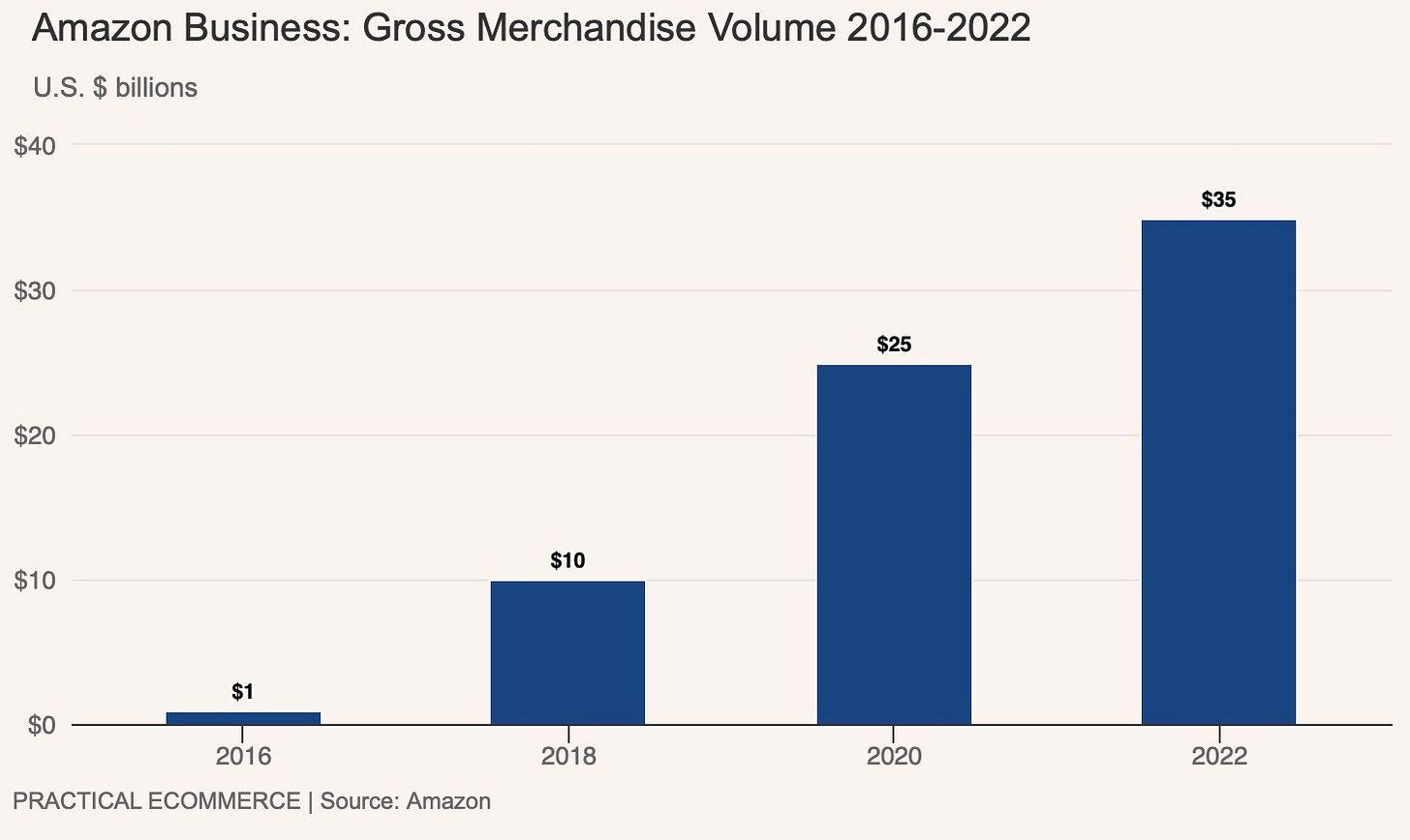 Amazon Business generó alrededor de $35.000 millones a nivel mundial en valor bruto de mercancía en 2022, frente a los $25.000 millones de dólares en 2020.