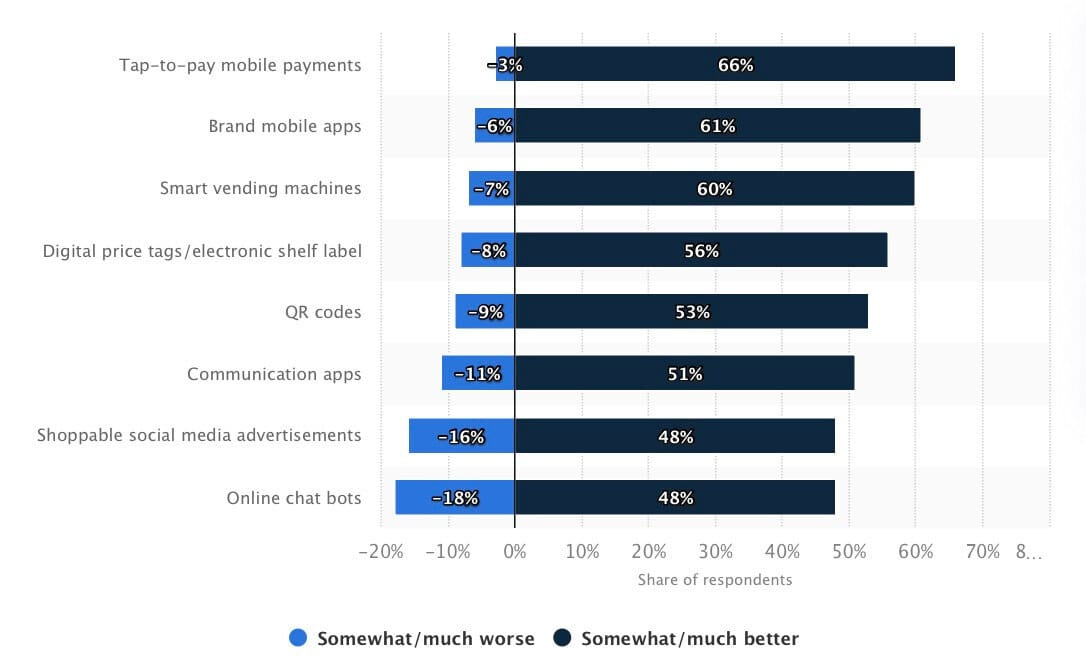 Statista ha medido el impacto de las tecnologías del Retail en la experiencia de compra de los consumidores en los Estados Unidos en 2022, por tecnología: