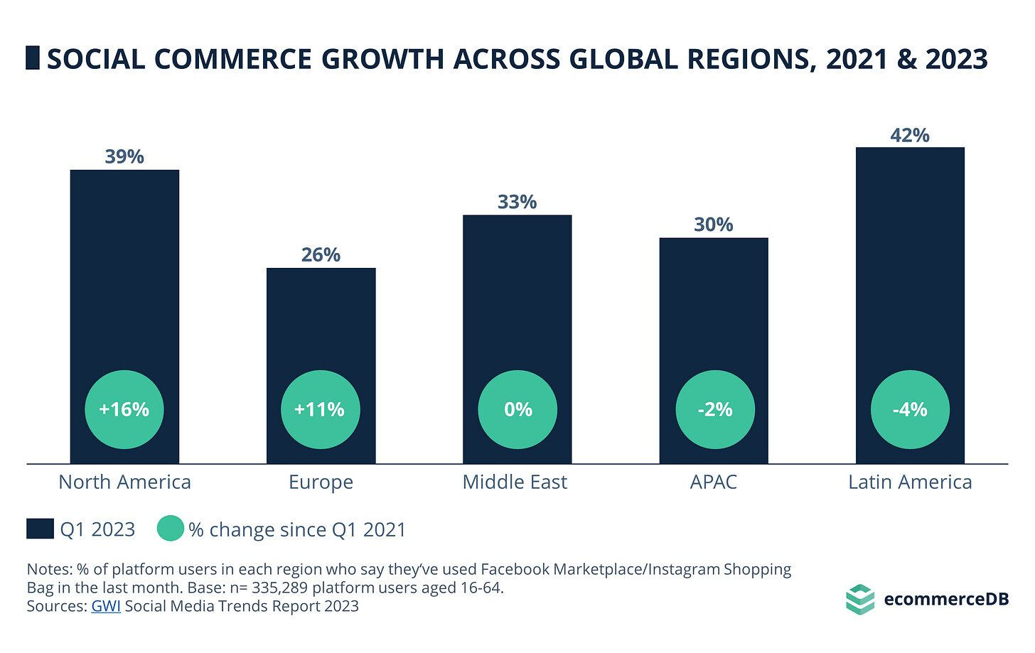 🎯 Imprescindible el report de eCommerceDB para entender por que el Social Commerce en Europa no sigue el ritmo del resto del mundo, los ratios se mantienen muy por debajo. América Latina está a la cabeza, con el 42 % de los usuarios de la plataforma diciendo que han utilizado Facebook Marketplace o Instagram Shopping Bag en el último mes. Asia y el Pacífico es la siguiente con un 30% mientras en Europa es del 26%. Sin embargo, esta cifra ha crecido un 11 % desde 2021, lo que sugiere un cambio lento pero constante en el comportamiento del consumidor.