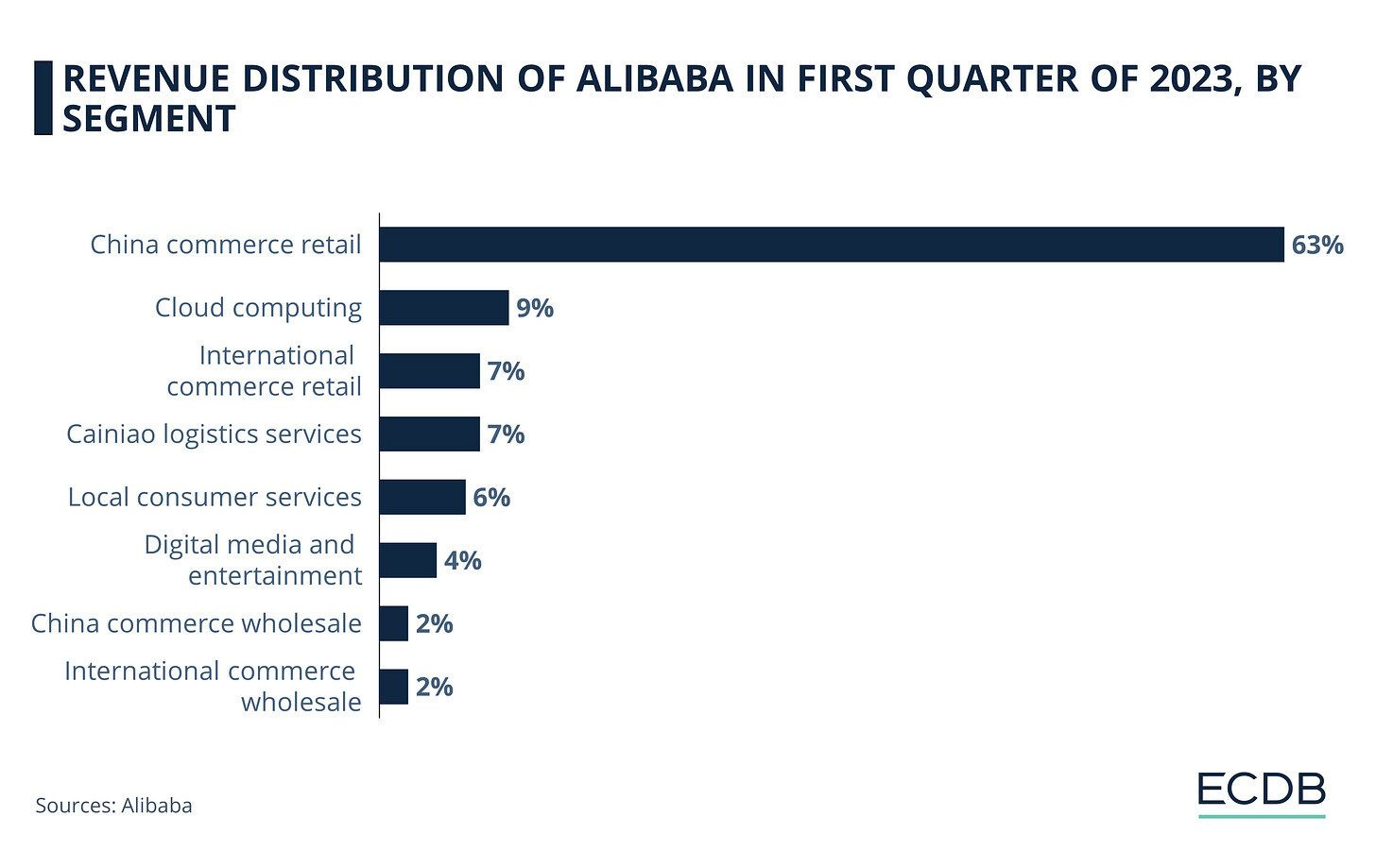 El segmento más grande de los ingresos de Alibaba proviene de sus plataformas nacionales de comercio electrónico, Taobao y Tmall. El primer trimestre de 2023 fueron el 63 % de sus ingresos.