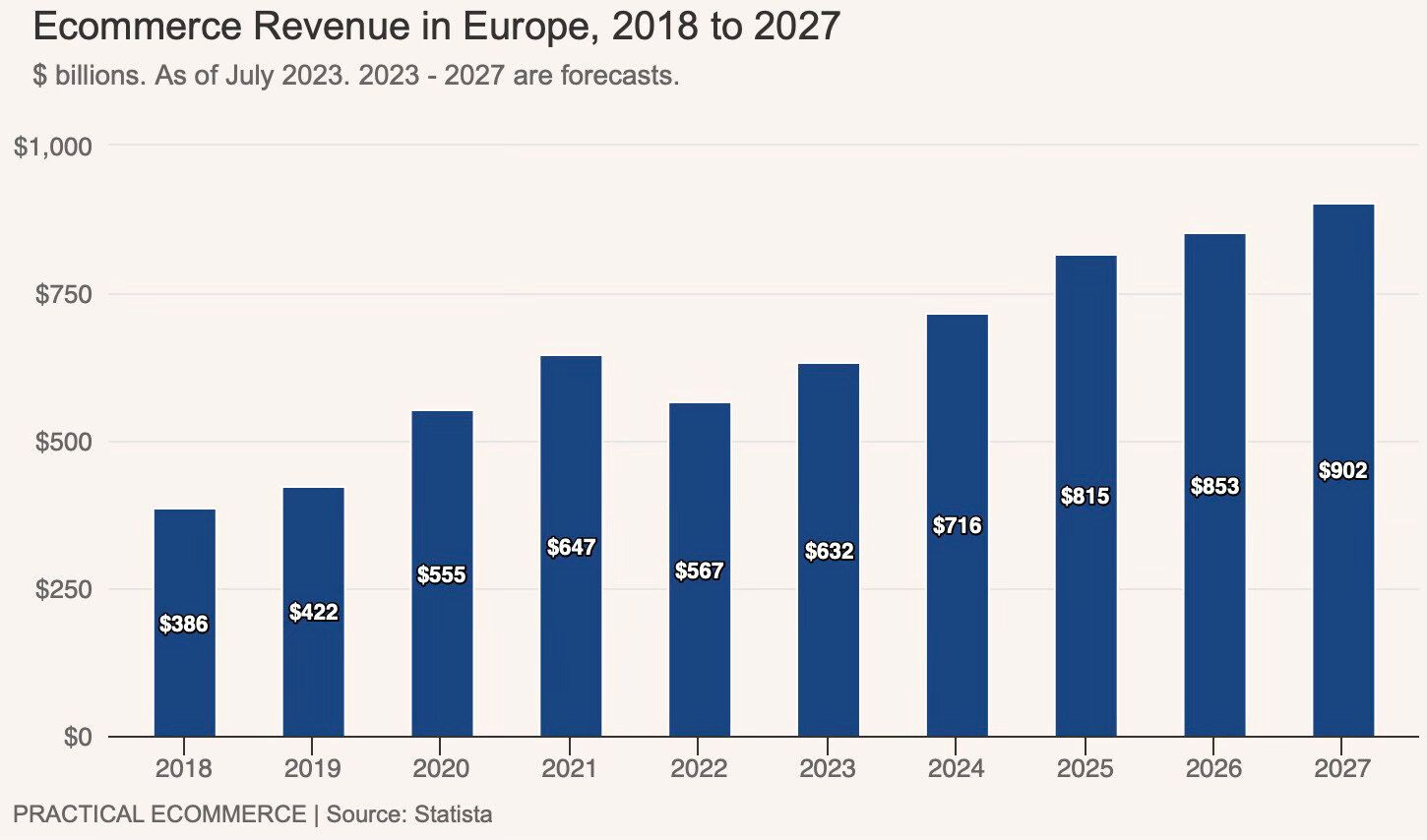 📉 Las tendencias de eCommerce en Europa. Se proyecta que los ingresos del crezcan un un +42,79%, pasando de los $639.000 millones en 2023 a los $902.260 millones en 2027.