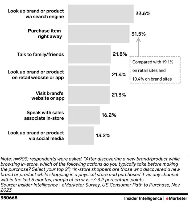 El 31,5% de los compradores que descubrieron un artículo en la tienda lo compraron de inmediato. Este número es mayor que el de los compradores que descubrieron un producto en la tienda y luego hicieron la compra a través de sitios web retail (19,1%) o sitios web de marcas (10,4%).