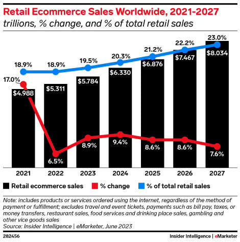 ⭕️ Este año, las ventas de eCommerce en todo el mundo romperán los 6 billones de dólares, unos $6.334 billones, lo que supone una quinta parte del total de ventas de Retail, exactamente un 20,1%.