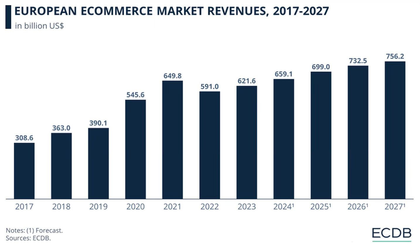 🖥️ El volumen de facturación del eCommerce en Europa superará los €600.000 millones este 2024 y se prevé que alcance los €750.000 millones en 2027.