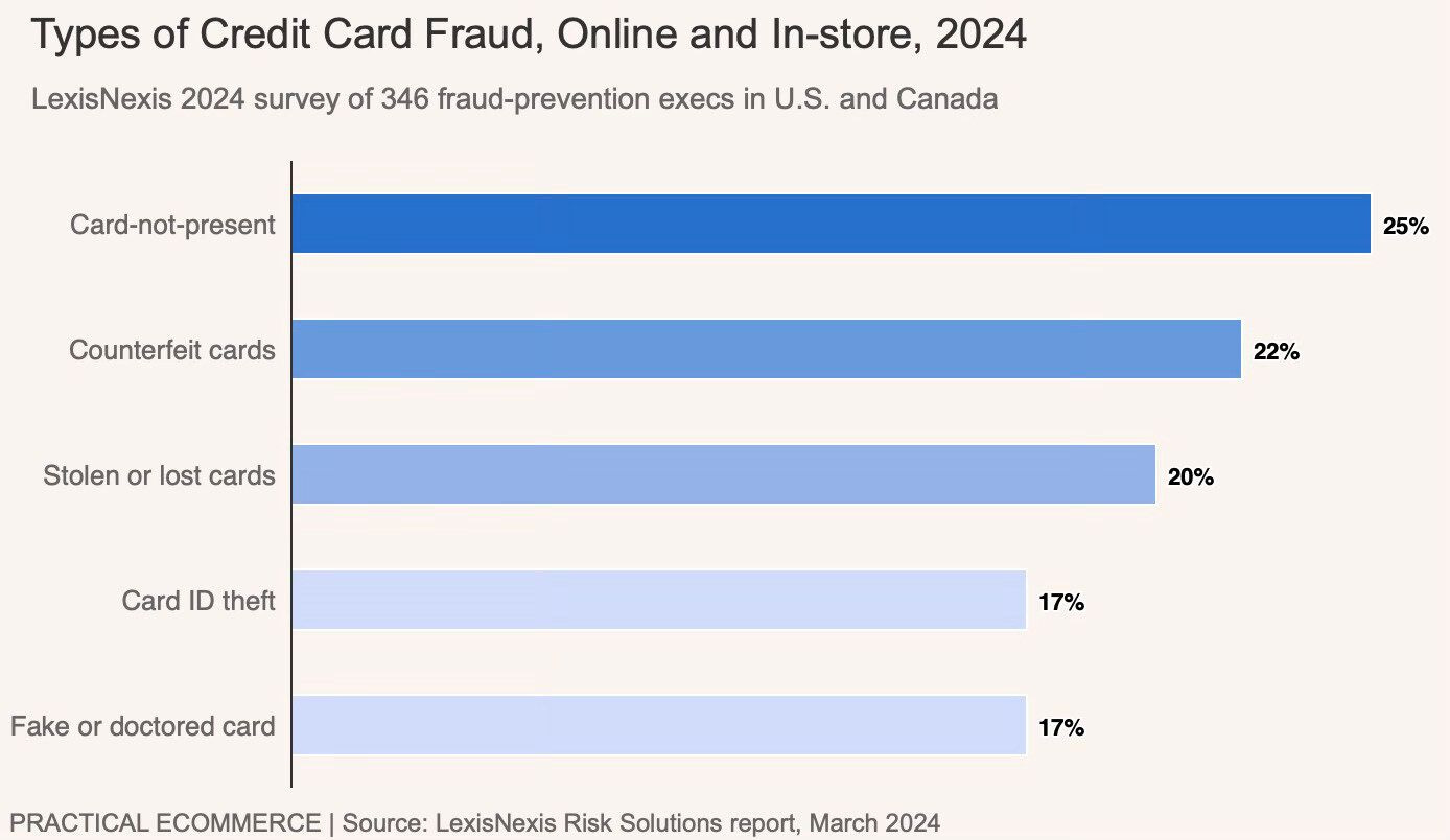 Tarjetas no presentes (25%) superó a todas las demás formas de fraude de pago, incluidas las tarjetas falsificadas (22%), las tarjetas robadas o perdidas (20%), el robo de identificación de tarjetas (17%) y el fraude de tarjetas falsas o manipuladas (17 %).