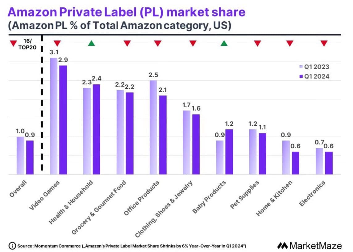 Artur Stańczuk publicaba los datos del Q1 2024, en los que mostraba cómo las marcas propias de Amazon cada vez pierden mas cuota.