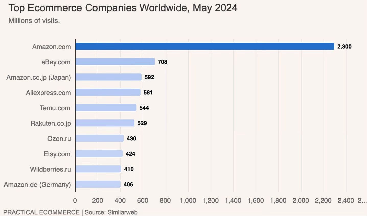 📉Este es el ranking de eCommerce a nivel global por tráfico en el Q2 2024. Con 2.300 millones de visitas en mayo de 2024, Amazon fue, con mucho, el sitio más visitado del mundo. eBay fue el segundo con aproximadamente 708 millones. En los principales mercados fue así: