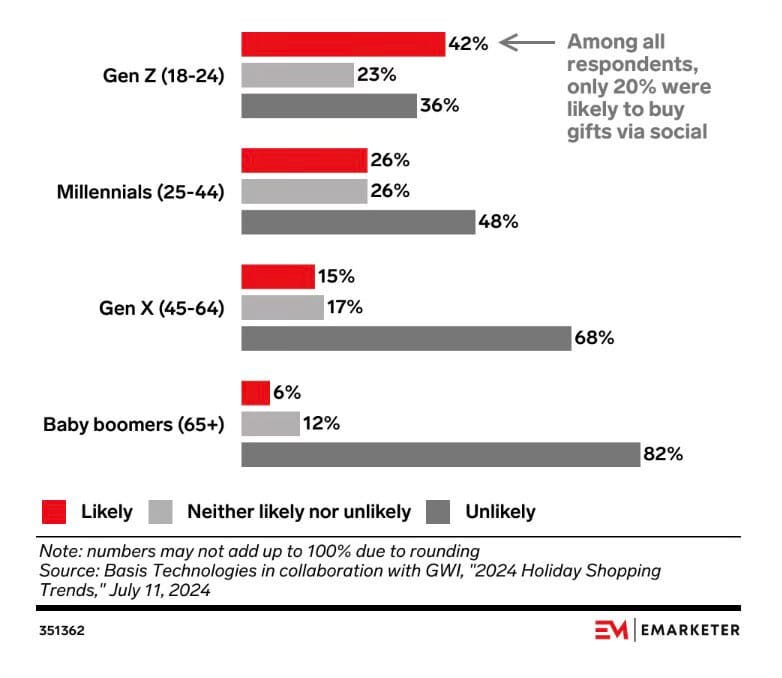 Consumo por generación: Con un 42%, la Generación Z es la que más recurrirá al Social Commerce, más del doble que el promedio general. Los Millennials les seguirán con un 26% mientras que la Generación X será de un 15%. Por último, solo el 6% de los Baby Boomers comprará regalos a través de estas plataformas.