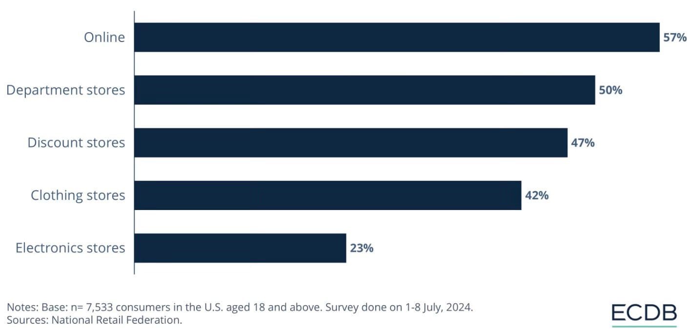 En 2024, las compras online son el canal preferido para la vuelta al cole en Estados Unidos, con un 57% de consumidores eligiéndolo. Los grandes almacenes también son populares, con un 50% de preferencia, seguidos por las tiendas de descuento con un 47%. Las tiendas de ropa y electrónica atraen al 42% y 23% de los compradores, respectivamente.