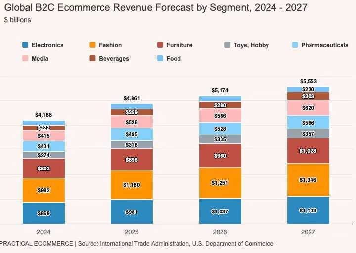 📊 Previsiones de ingresos en eCommerce en el canal B2C a nivel global (2024-2027). Dos apuntes: