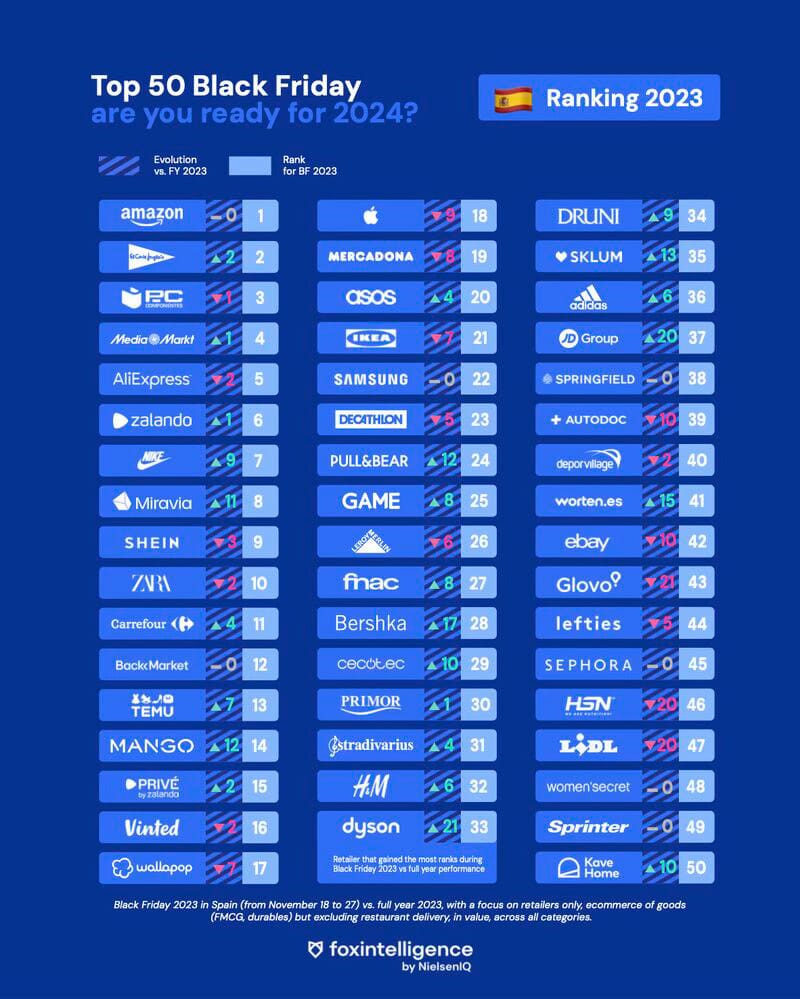 🏆 FoxInteligence publica un ranking de los retailers españoles en el BlackFriday de 2023 Vs su evolución en el año completo.