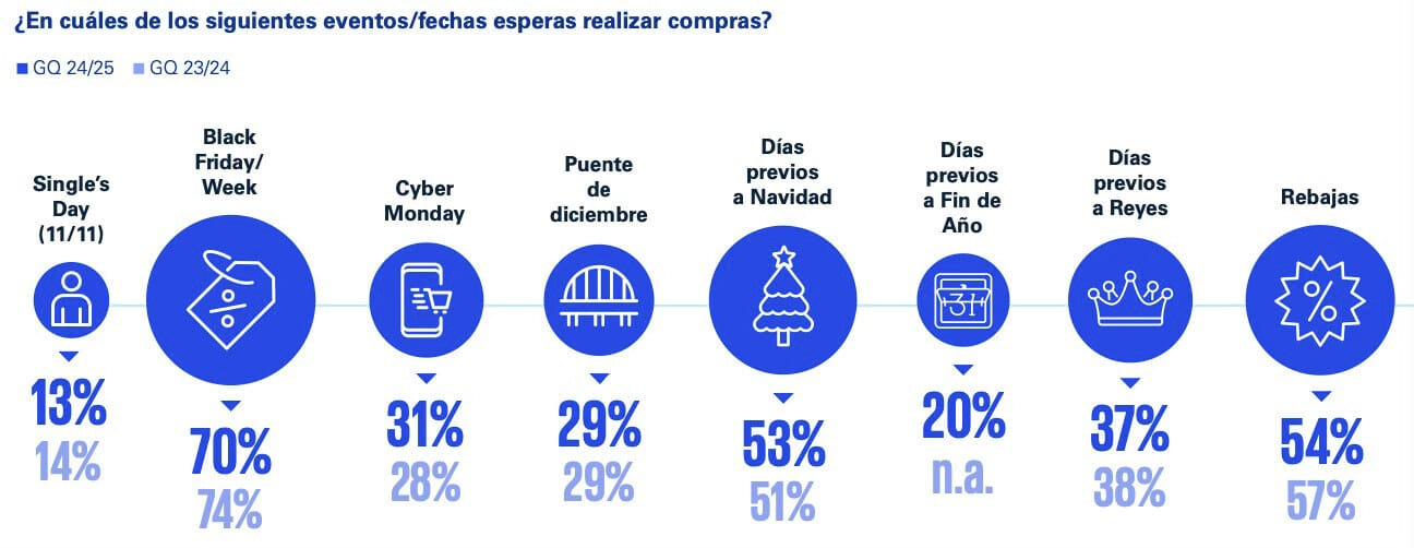 Preferencia por eventos promocionales: El Black Friday destaca como el evento con mayor intención de compra, con un 74% de los encuestados planeando realizar adquisiciones durante este período. Otros eventos, como las rebajas de enero (57%) y los días previos a Navidad (51%), también son relevantes.