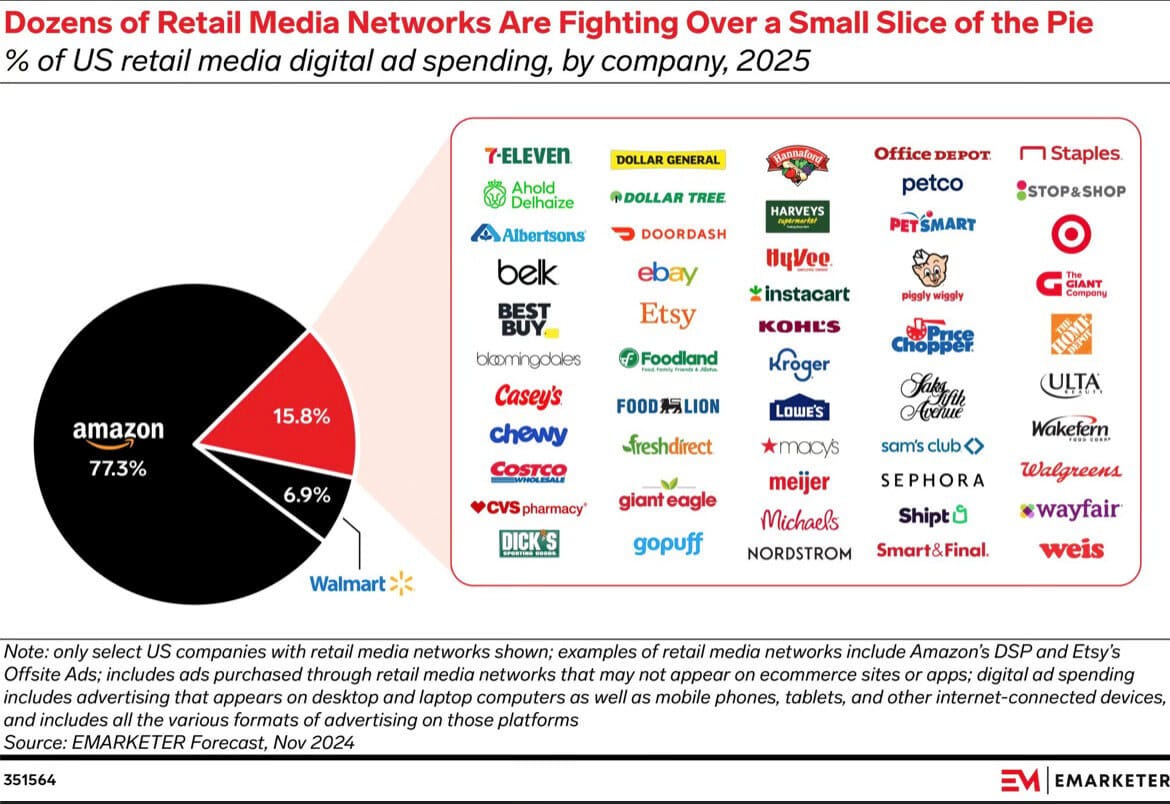 🎯 Sarah Marzano publicaba una infografía con las tendencias de CommerceMedia, donde destacaba las previsiones de Retail Media para EE.UU. en 2025., increíble el poder de Amazon en este campo…