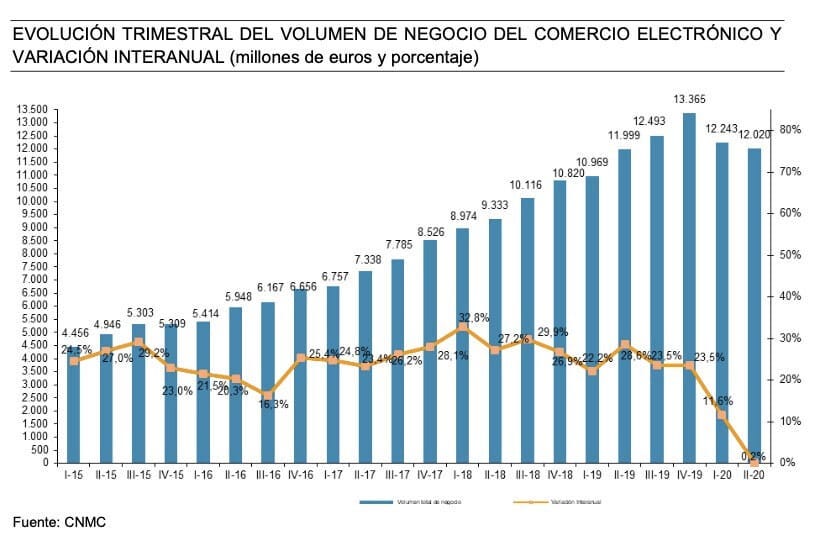 📱 Atendiendo a los datos de la CNMC, el eCommerce superó en España los 12.000 millones de euros en el segundo trimestre de 2020, un 0,2% más que el año anterior