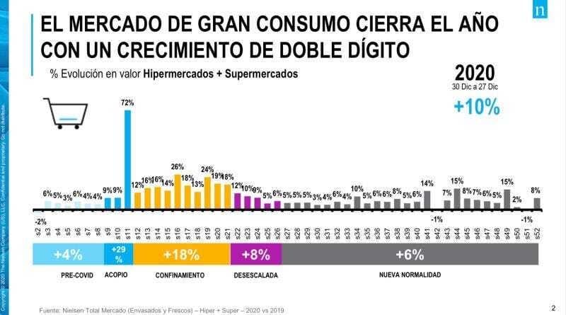 🛒 Patricia Daimiel de Nielsen compartía como cerraba el Gran consumo el 2020 en España, un crecimiento del 10% en hipers y supers, sobre una previsión muy por encima del 2-3%. Un crecimiento soportado por el consumo en el hogar derivado del cierre del sector Horeca y del comercio tradicional a retailers mas grandes.